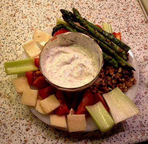 Én ehhez a nasitálhoz spárgát grilleztem, angol zellerszárat vágtam fel nyersen. Paradicsom is nagy kedvencem, amit balzsamecettel spricceltem meg. Piros kaliforniai paprikát is vágtam hozzá. Dipping szósz is kell a nasihoz. Én szimplán dijon-i mustárt kevertem a tejfölhöz. Voilá!